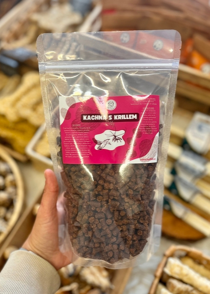 Charakteristika: Výcvikový pamlsek vyrábíme ve tvaru drobných peletek o průměru 8mm a délce cca 5-6mm. Jde o vařený produkt z převládající několika druhů masových mouček s přídavkem mořského krillu a jen s menším, pouze pro soudržnost nutným rostlinným podílem, který neobsahuje lepek.