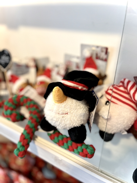 Plyšová hračka pro psa se zvukem (uvnitř všité pískátko). 3 druhy: Santa, sob, sněhulák. Materiál: polyester. Velikost: 18–29cm.