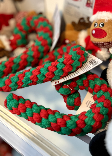 Hračka pro psy ze spleteného lana. Bavlněný uzel ve tvaru cukrové hůlky. Rozměry: 19cm. Materiál: bavlna/polyester. Barva: červená/bílá/zelená